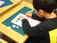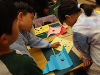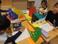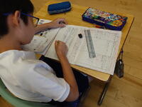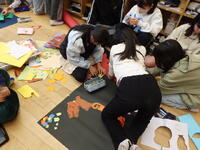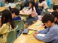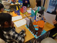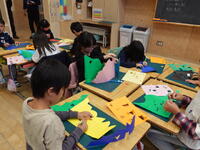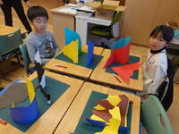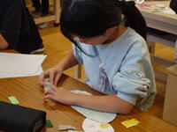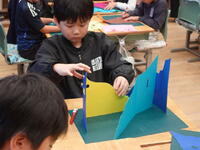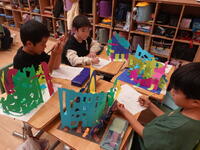 2年生は、作品作りの見通しをもてる工夫として、様々な窓の画像を見て、窓のイメージを膨らませ、どんな切り方をすればどんな窓を作れるかお試しの時間を取りました。2年生はこの単元でカッターを初めて使いました。安全面にも気をつけながら、いろいろな形の窓を作っていました。