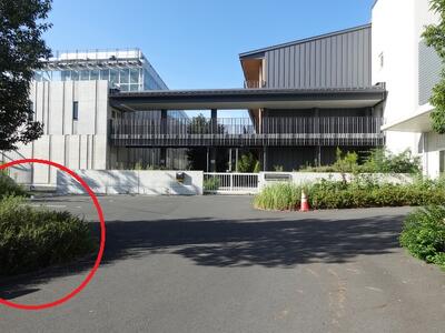 正門を出て左に曲がり、2~3歩歩き、きょろきょろすると見つかります。