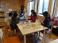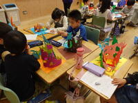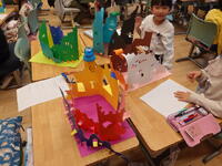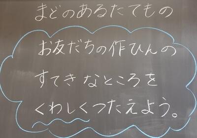 関わりをもてる工夫として作品作りの途中に、友だちの作品を鑑賞して、いいところを見つけ出して伝え合う、「ほめほめタイム」の時間を取りました。お互いの作品のよいところをまどの「形」を視点に伝え合いました。自分の作品のよさに気づくとともに、友だちの作品のよさも知ることができ、作品作りに生かすことができました。