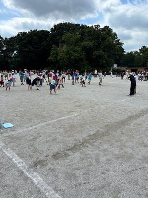 前回のニコニコ活動の経験を生かして、リーダーの5、6年生は同じグループの低学年の児童へわかりやすく遊びの説明をしていました。