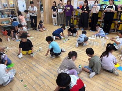 教室の机を外へ出し、広い空間とたくさんの材料から、子ども達は組み合わせ方や並べ方を考え工夫して、楽しそうにかつ真剣に創作活動に取り組んでいました。