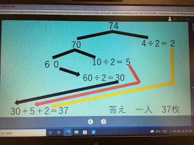 「74 ÷ 2」皆さんならどのように計算しますか?先日、算数の時間に暗算で割り算をするには、どうするかを考えました。画像は児童の考えたものですが、このほかにもたくさんの考え方が出ました。大人になるまでに、解決への道筋を吟味することや、その道筋は1つではないことに気付ける人になってほしいと思っています。