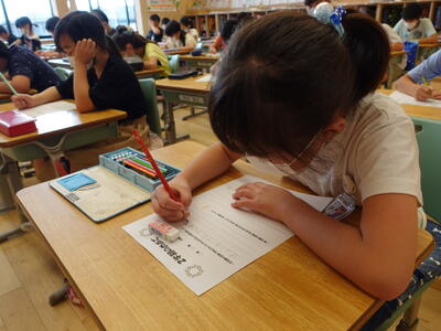 隣の学級では音楽を聴きながら、思い浮かんだ自分だけの物語を、ワークシートに書き込んでいます!「ぶんぶんぶんハチが飛ぶ」を元にしたアレンジ曲を聴きながら、思い思いに想像を膨らましていますよ!