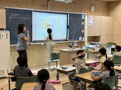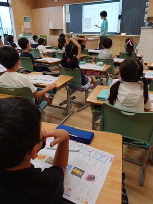 1年生が書写の授業をしています!ちょっと慣れてきて、形が崩れ始めている「数字」のかっこいい書き方を、子どもたちがディスカッションしながら発見していく授業です。本校のプロジェクターは、映したものの上に、デジタルペンで色つきの線が自由に描ける!という優れものです この機能が最大限に生きるのが、1年生の書写なのですよ!先生の書き込み、子どもたちの書き込みが自由自在な上に、授業の終わりには「パチッ!」と電源を落とせばいいのですから!