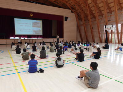 明日から開始する1年生の水泳学習に向けて、学年集会を行いました。安全を守るために何に気をつけたら良いかを、パワーポイントで紹介する形でやりました。