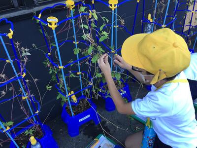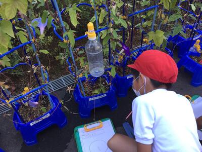 1年生が育て始めたあさがおですが、かなり成長してきたので間引きを行いました。どうして間引きをする必要があるのかを子どもたちにも理解してもらえるように説明をしました。