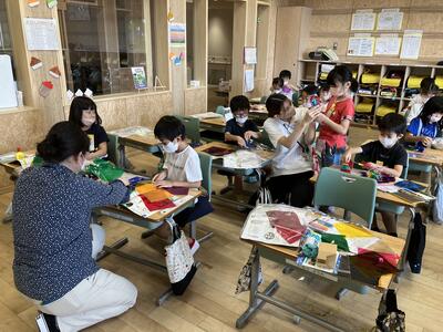 1年生の図工の学習で、七夕飾りを作りました。折り方や切り方を工夫して作品を作っていく学習です。