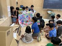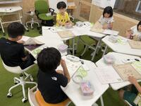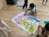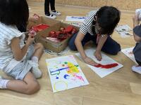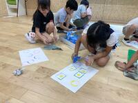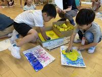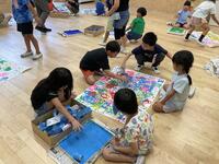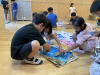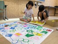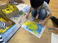1年生が班ごとに大きな模造紙を広げ、教室いっぱいに散らばって、全身を使った動きで元気よくプラカップの縁を利用したスタンプ遊びをしています!何をしているのでしょうか?これは「スタンプペッタン」という図画工作の授業を行なっているのです!