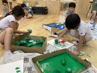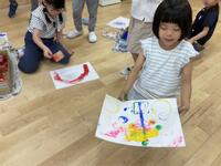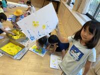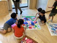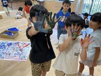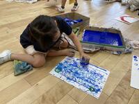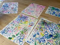 これを読んでいるみなさんも私も、小学生の時に図画工作を学びました。図画工作とは以前はその名の通り図画と工作の制作を通して、造形的な資質能力を身につけるものでした。図画や工作では、あらかじめどんなものを作るかが決まっています。ゴールが決まっているといってもいいでしょう。一方、造形遊びはその名の通り遊びを通して資質能力を身に付けようとしています。作品を作り上げるというゴールではなく、そのプロセスをとても大事にしています!遊びながら働く資質や能力が重要です。例えば、子どもたちは、大きな模造紙に向かい、思い思いのプラカップでお気に入りの色のスタンプを押したり、カップを転がしたりと使い方をも工夫しながら「きれい」や「いい感じ」を見つけています。そして、もっとそれを「きれい」に「いい感じ」にしようと挑戦します。それは大人的に言うと「補色の組み合わせ」「バランスの追求」などの試みです。また、子どもたちは、自分の手の動きや変化する様そのものが大事で、それ自体を飽きもせず繰り返します。それは「行為そのものへの没入」で、そこから「発見」が生まれたりするのです。色や形に向き合って「夢中になる時間そのものが学び」ですので、作品として成り立たなかったり、形に残らないことは問題となりません!