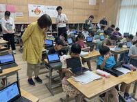 今日は1年2組の子どもたちが、初めてTOIOというプログラミングを学ぶ教材を使って行う授業の日です!1年生の子どもたちにとっては、プログラミングの機器が置いてある専用室に初めて入れる日でもあります!たくさんの新しい教材のパーツに触れるので、応援の職員もたくさん入っています!子どもたちの前に置かれているのは、ゲーム機に似た形状のTOIOと呼ばれる電子機器です。子どもたちはワクワクが止まらない様子!