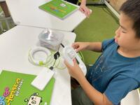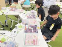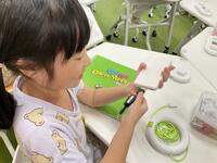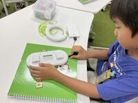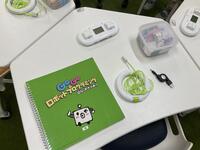 1年2組の先生は今年2年目の教員です!おそらく昨年の学級では、導入の際、理科大学の学生の支援があったのでしょう。今回は自分が説明しなければなりませんので、かなり緊張の様子で、ひとつひとつ手順を子どもたちに確認していきます!電源を繋いで、たくさんあるスイッチを間違えないように順番に操作しながら、子どもたちも準備をしていきます。子どものプログラミンングを受け付けるのは、ミニミニのボットのキューブちゃん!「命令を始める」「1歩前に進む」「命令を終わる」というようなカードの上をキューブちゃんにトレースさせることでキューブちゃんに動きを命令していきます。自分の命令がしっかりキューブちゃんに伝わると、キューブちゃんはちゃんとその通りに動いて、「よくできたでしょう!」というようにプルプルかわいく震えて喜びます!これには子どもたちもにっこにこで大喜び!