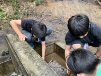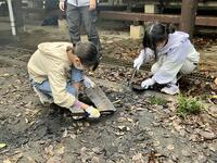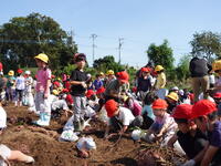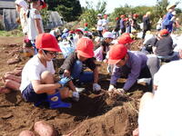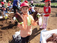 いよいよ芋掘り!お手伝いの先生方に、スコップで土をほぐしてもらって、小さな手で頑張って掘ります!出てくる出てくる大きなおいもがザックザク!「おっきいよーっ!」「せんせいみてー!」「おもーい!」あっちでもこっちでも大歓声が上がります!土の中から出てくるのは、お芋だけではありません!幼虫や、ツルを刈られて行き場を失ったバッタたちがいっぱい出てきました!収穫した芋は、お家に持って帰ったり、給食で全校の子どもたちに食べてもらったり、くろもり会頒布会を開いたりする予定です!お楽しみに!