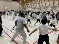 さてさて、ゲームの練習ですよ!まずは「猛獣狩り!」猛獣狩りに行こうよ!の掛け声の後、猛獣の名前が提示され、名前の音数の人数で集まるアレです。最初の猛獣はアフリカゾウ!子どもたちは真剣そのもの!あとひとり誰か来てー!という悲鳴が体育館に響きます。次の猛獣は「コ・ウ・チョ・ウ・セ・ン・セ・イ」ん?・・・。