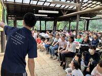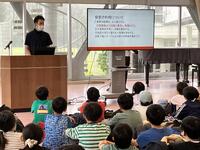 館内の説明や布団のたたみ方など丁寧な説明を受けた後は、インドアビンゴの始まりです!小雨なので山ビンゴも行けるかなと思いましたが、斜面ばかりのコースなので、施設の方からストップがかかりました!(当たり前!安全最優先!)ビンゴ係がしっかりと説明の会を進めます!司会のI崎さんは、堂々と立派な司会ぶりプラス、施設の人の話が終わりそうだという気配を察して立ち上がって、スムーズに進行するようしっかり気を配りながらの仕事ぶりが光りました!