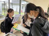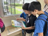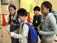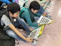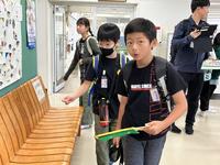 インドアビンゴは、25枚の写真をヒントに、館内のある場所を特定し、その場所の近くに貼られた虫か野菜のシールを探していくというものです。写真以外に手がかりがなく、想像するよりもかなり難しいのですが、子どもたちは、体育館に向いている矢印と、館内案内図を結びつけて考えることで、「この辺にあるんじゃないか?」と推理したり、床に這いつくばり、見る視点を変えて探してみようと工夫したりと、ここでもさすがおおぐろの森小学校という頭の使いようでインドアビンゴを進めていました。