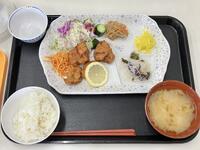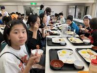 ゲームの途中ですが、先に配膳係は下の食堂に降りて、昼食の準備が始まりました!これでここに林間学園に来るのは3回目ですが、初めて見るようなものすごいスピードでお盆が並べられ、そこに次々とおかずプレートが置かれ、ご飯をテキパキとよそい、それを配り・・・素晴らしい働きの5年生でした!そのおかげで、みんなしっかりにこにこ林間学園初めての食事であるランチをいただくことができました!ここの唐揚げ美味しいですよね!