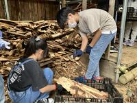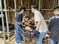 ここからは、火を使うことになりますので、焼き板指導のお兄さんが丁寧に説明してくれます!まずは竈門に火を起こすことから始めます。新聞紙を丸めて、三角屋根を作るように細い板を組んでいって・・・焚き火の基本ですね!基本を学んだら、実践あるのみ!いくら知識があっても、経験には敵わないことがこういう作業にはあるのですよね!