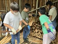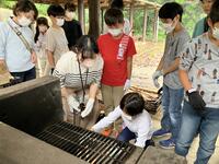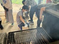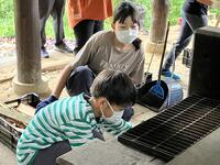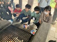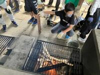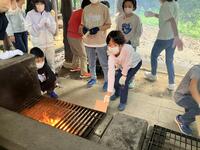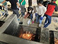 ある程度炎が大きくなったら、板を焼いていきます。やりすぎないように、しかし板の表面を炭化させるようにと、この加減が難しいのと、薪を燃やせばたいそう煙が出ますので、風向きによって目がしみたり、むせてしまったり、子どもたちには試練の時でした!