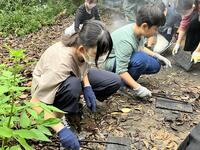 美味しいお昼をいただいた後は、焼き板作りに挑戦です!まあまあ雨も落ち着いていて、傘なしでもに移動できるぐらいの霧雨が降っています。子どもたちは斜面を下って、焼き板作り会場の屋根のある第3炊事場まで森の中を進みました。係児童は荷物を持っての斜面移動ですが、慎重に慎重に滑らないように降りていきます。