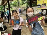 ある程度焼き上がった板は、炭になっている部分を削り、タワシで擦り、新聞紙で磨くとあら不思議!いい具合の艶がのった趣のある焼き板の出来上がりです!思い思いの絵や文字を描いて、世界にひとつの林間学園思い出の品が出来上がりました!