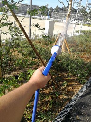 本日、プールへの通路で4年生ふたりと用務員の草原さんが、緑色のネットを一生懸命手すりに結びつけていました。下をのぞいてみるとゴーヤが蔓を伸ばしています。ぐんぐん育って緑一面ゴーヤのカーテンができるといいです!4年生のふたりは、選ばれし者!らしいですよ。ありがとう!