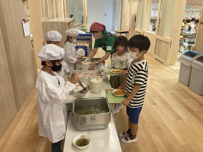 午前午後の日程のタイトな日程の中、給食の配膳は大人の手でやってしまいたいところですが、4月からぐんぐん成長している1年生は、自分たちで頑張っています!素晴らしい!