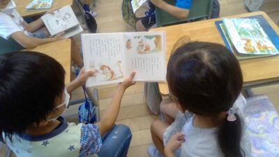 1年生の読書活動で、「2人読み」を行いました。同じ本を、2人で交互に読むことで、相手が聞き取りやすい声の大きさを考えたり、スピードを調整したりする力がつきます。