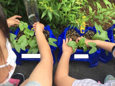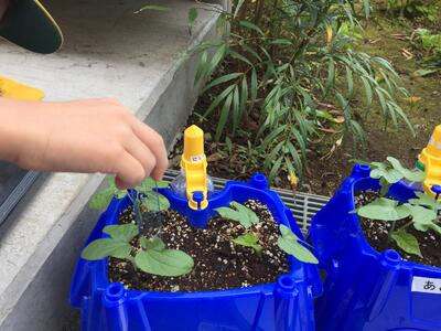 1年生が育て始めたあさがおですが、かなり成長してきたので間引きを行いました。どうして間引きをする必要があるのかを子どもたちにも理解してもらえるように説明をしました。