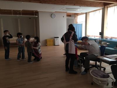 本日、内科検診が行われました。廊下では静かに待機する子どもたち。聴診器で体の検査をする大事なことだという認識がきちんとできています。