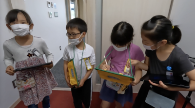 学校の各所に行かないと解けないクイズがのっているプリントを持って、楽しそうに探検していました。