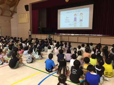 明日から開始する1年生の水泳学習に向けて、学年集会を行いました。安全を守るために何に気をつけたら良いかを、パワーポイントで紹介する形でやりました。