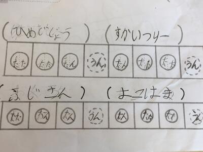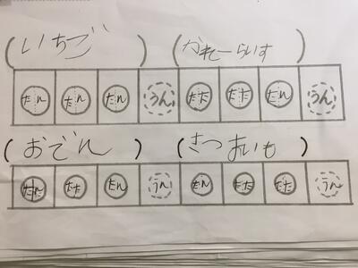 1年生の音楽の授業では、自分で音楽を作っています!果物や建物の名前をそれぞれ入れて作っているので、子どもによって個性が出ていて面白いです。
