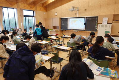 社会科で世界の国々の学習です!世界には多くの国があり、それぞれに特色があることに興味を持ち調べていく第一歩として、世界の国クイズをグループに分かれて作成しています!