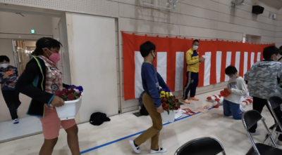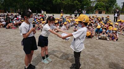 2~6年生から1年生へ、メダルやアサガオの種などを贈りました。こういった思い出を大切にしてほしいですね。