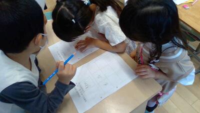 1年生はひらがなのお稽古をしながら、言葉を見つける遊びをしています!例えば「の」のつく言葉をひとつ思い浮かべるのですが、友達と違うものを思い浮かべなくてはなりません!自然に言葉が増えていきますね!