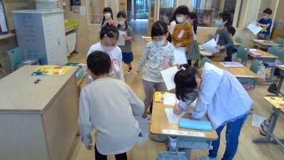 来週1・2年生でペアになり、学校探検を行います。それに向けて、今日はお互いの名前を確認し合う、名刺交換を行いました。