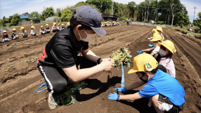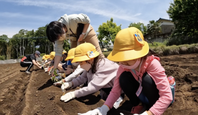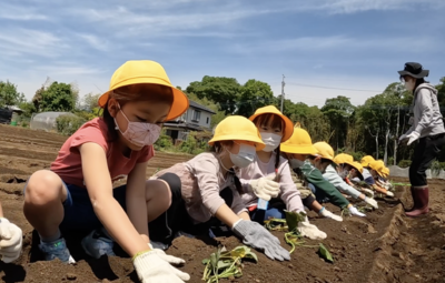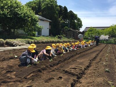 今日は天気がよく、学校近くの畑へ行くことができた1年生。さつまいもの苗植えを行いました。