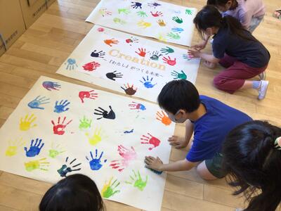 今日は6時間目の総合の時間に、2学級合同で学年目標の掲示物を作成しました!懇談会でもお伝えさせていただきました通り、本年度の4年生学級目標は、「Creation 〜『わたし』が作る未来〜」です。その学年目標に則り、一人一人が好きな色の手形を自由に押していきました!色鮮やかな素敵な掲示物ができました!