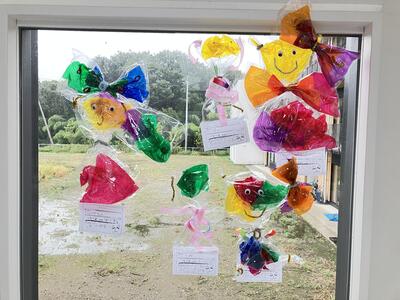 校舎を結ぶ連絡通路に、キラキラとした生き物たちが現れました!1年生の生み出した、「ひかりの国のなかまたち」です!今日の外は台風通過により生憎の雨模様ですが、キラッキラの仲間たちが飾られたことで、明るく華やかな連絡通路になりました!おおぐろ小の外の里山風景にも、なかまたちは馴染んでいます!