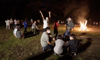 ちょっとした何でもないレクですが、暗闇で火を囲んでの高揚感で大盛り上がりです!さらにシークレットゲストの治田先生と山岡教頭も紹介されました!さてさて、いよいよ盛り上がりも最高潮!マイムマイムとジンギスカンのDancing Nightの始まりです!