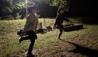 本日のメインイベントと言っていいでしょう、キャンプファイヤーです!校長が火の神を行うというのは子どもたちにとっても暗黙の了解で、事前の準備が進められていましたが、なんと森の暗闇で控えていたのは、ここにいるはずのないシークレットゲストの松本先生です!係の子どもたちは、はじめ「校長先生が隣で撮影していたら、すぐバレちゃう」とか言っていたのですが、火の神の正体が知らされると、場内はすごい盛り上がりとなり、この企画は大成功となりました!