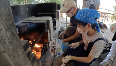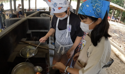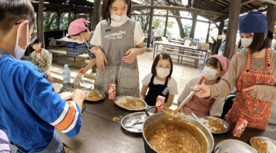 うちわで扇いだり、よくかき混ぜたり、分担しながらカレー作りを行っています!
