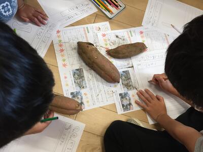 本日2年生の234組は、いもほりを行いました!先日、つるは力を合わせてとりましたので、今日は知面の中からおいもを掘り出すのです!掘りはじめてびっくり!ぎっしりと形のいいイモが次々と掘り出されるのです!大きないもがひとつのつるから8本10本12本と面白いように収穫できました!子どもたちも職員も大興奮でした!