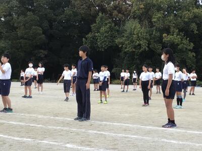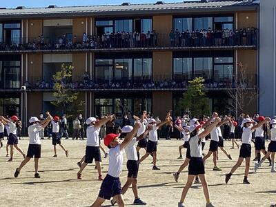 運動会に向けて、1.2.3組が体育館にて合同でダンス練習をしています。