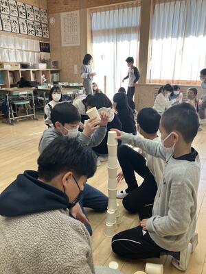 5年2組は、紙コップでタワーを作ったり、友だちの投げたコップを受け止めるゲームで大盛り上がり!