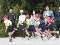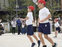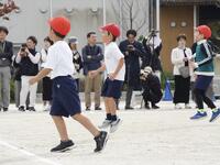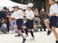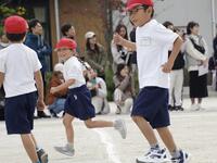 プログラム3はレク走です!「異世界混合大レク走大会」と名付けられた、先生出す表示によって、カンガルーになったりフラミンゴになったりカニになったりしながらゴールを目指す競技です!1年生のすごいところは、50m走とこのレク走の並び方が違うところ!普通だったらどちらも共通にしてしまうところを、いろいろな友だちと競走を楽しもうということで、種目ごとに並び方が違うのです!それをちゃんとこなすのが本校の1年生のすごいところ!子どもたちのつぶやきによると、カンガルーの両足跳びが最もきついとのこと!たまに、サービスの「人間!」が出ると、子どもたちは大喜びでスキップをしながらゴールしていました!