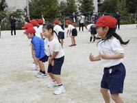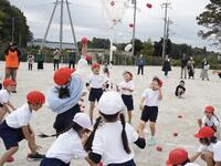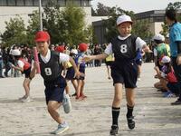 プログラム2はチェッコリ玉入れです!学年主任のK藤先生のスポーツ観戦で身につけた高らかな「20XX年オリンピック競技〜Chekkori TA•MA•I•RE〜!!」というアナウンスで決戦の火蓋が切られました!チェッコリ玉入れのルーツは諸説あるそうですが、有力なのはなんと私が教員になった40年前ぐらいに埼玉の川越あたりの小学校で生み出されたとか・・・。1年生はチェッコリを踊っては投げ踊っては投げしながら、3回戦行います!音楽がかかると、子どもたちは可愛らしく踊った後カゴ目掛けて球をバンバンなげ入れます!下で支えるのは日頃より担任を補助して子どもたちに寄り添っていただいている皆さん!たまとともに頭に降りかかる砂つぶを払うこともなく、じっとカゴを支えます!踊って投げて踊って投げて、やがて音楽が鳴り止みました。さてさて、球を数えましょう!1・2・3・・・優勝はK藤先生の1組でした!気合い勝ち〜!!