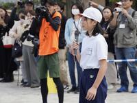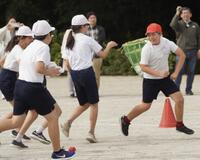 3年生運動会、3種目目の競技はレク走です!今年はオリンピックイヤーでしたので、オリンピック競技にちなんだレクそうを考えたそうです!子ども達がスタートすると、すぐにハードルの障害物が現れます!ぴょんぴょん跳んでクリアすると、次は平均台です!慎重にゆっくり歩く子、何事もないようにすたすた渡っていく子と様々です!トラック中央部まで来るとクジが置いてありますので、それをめくると、競技が指定されているのです!サッカー、ウエイトリフティング、体操、バスケットの4種類の種目が用意されています!ウエイトリフティングのバーベルは最高がなんと100t!!という表示です!すごく重そうに、いい質感の錘とリアルにしなるバーが素晴らしい!さすが図工の研究校!体操などは子どもたちのポージングに対して、子どもの係が白旗赤旗をあげて判定!これも可愛らしくて素敵なアイデア!そして、3年生ですから競技の準備もどんどん自分たちで行います!合わせて110t?のバーベルや平均台を軽々運ぶかっこいい3年生にも拍手です!
