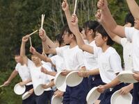 そして、高学年運動会の最後を飾る表現種目「ダイナミック!We are Heroes!〜これがおおぐろ舞style!」です!5・6年生は10月の初めに、海外からやってきたHeart Globalのキャストさんたちと歌とダンスのミュージックアウトリーチを体験しています!また、ダンスを本格的に習っているリーダーや、センスの良い頼れるリーダーが複数いることも強みです!今年は民舞的なものにも挑戦しました!ミニ太鼓を鳴らしながら沖縄を感じさせる華麗な舞を披露しました。現代の子どもたちの普段の姿勢には恐らくないであろう、腰を落とした力強いフォームがしっかり決まって、それはそれはかっこいい高学年らしい舞となりました!本当は大きな写真で子どもたちの真剣な眼を伝えたいところです!