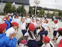 最後の種目は可愛い可愛い1年生のダンスです!「舞台に立って」「ウィル」「ウルトラソウル」「メラ」そして再び「舞台に立って」まで、5曲のメドレーに合わせて子どもたちは元気いっぱい踊ります!学年運動会の最後を飾るダンスなので、校舎のテラスにずらり並んだお兄さんお姉さんたちも大声援を送っています!
